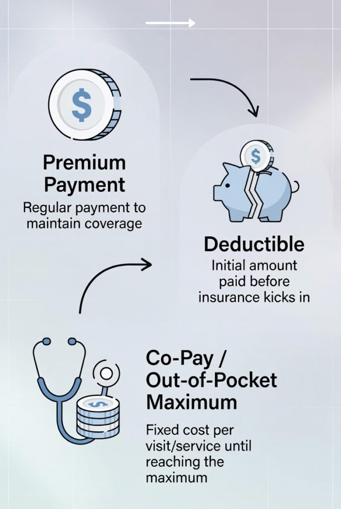 Co-payment refers to fixed amounts patients pay for specific services like doctor visits or prescription medications. Co-insurance represents a percentage of medical costs that policyholders share with insurance companies after meeting the deductible. Understanding these cost-sharing mechanisms helps individuals estimate total healthcare expenses.